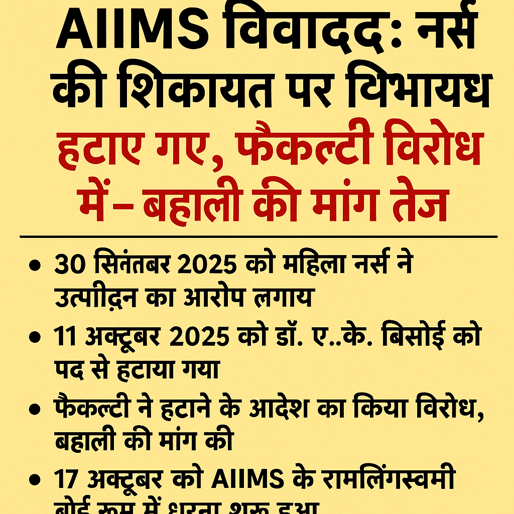 AIIMS विवाद: नर्स की शिकायत पर विभागाध्यक्ष हटाए गए, फैकल्टी विरोध में उतरी – बहाली की मांग तेज